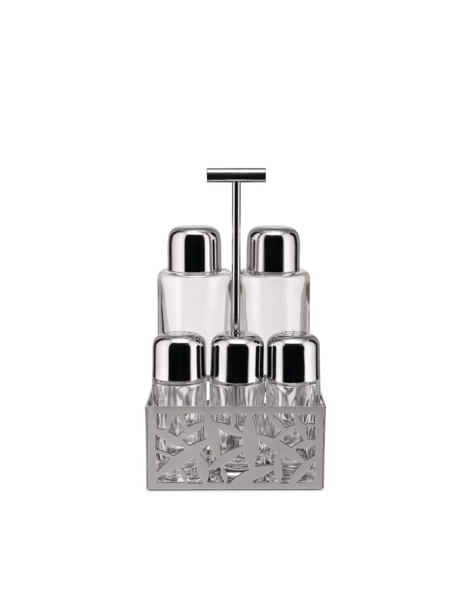 Het Alessi Cactus menagestel is een stijlvolle set met de vormen van een cactus op de roestvrijstalen houder. De set bevat een olie- en azijnfles met schenkdop en een zout, peper- en kruidenstrooier die samen in een onderstel zijn gevat. De set is ontworpen door ontwerper Marta Sasoni.