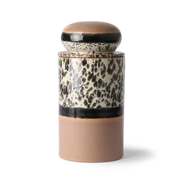 De HK Living 70’s voorraadpot is gemaakt van beige en briun gekleurd geglazuurd aardewerk. De voorraadpot heeft een inhoud van 1 liter, een diameter van 11 cm en is 22,5 cm hoog. Gebruik de voorraadpot om ingrediënten te bewaren.
