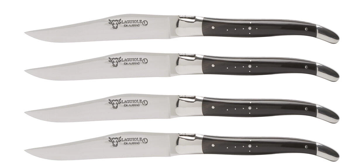 De Laguiole en Aubrac steakmessenset bestaat uit 4 messen met een messenstalen lemmet van 11,5 cm. Het totale mes heeft een lengte van 23 cm. Het heft van het mes is van diepzwart buffelhoorn. U gebruikt het steakmes met de gladde snede voor het snijden van bereid vlees aan tafel.