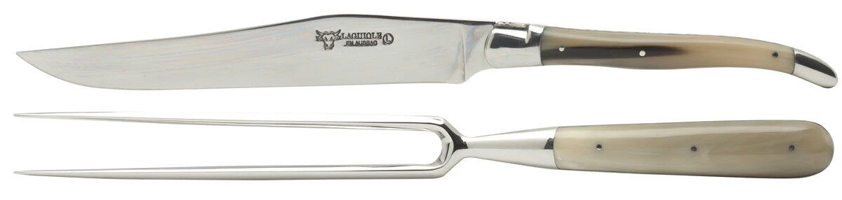 De tweedelige Laguiole en Aubrac trancheerset bestaat uit een messenstalen vleesvork (17 cm) en vleesmes (18 cm) met heften van massief hoorn. U gebruikt de trancheerset voor het trancheren van vlees.