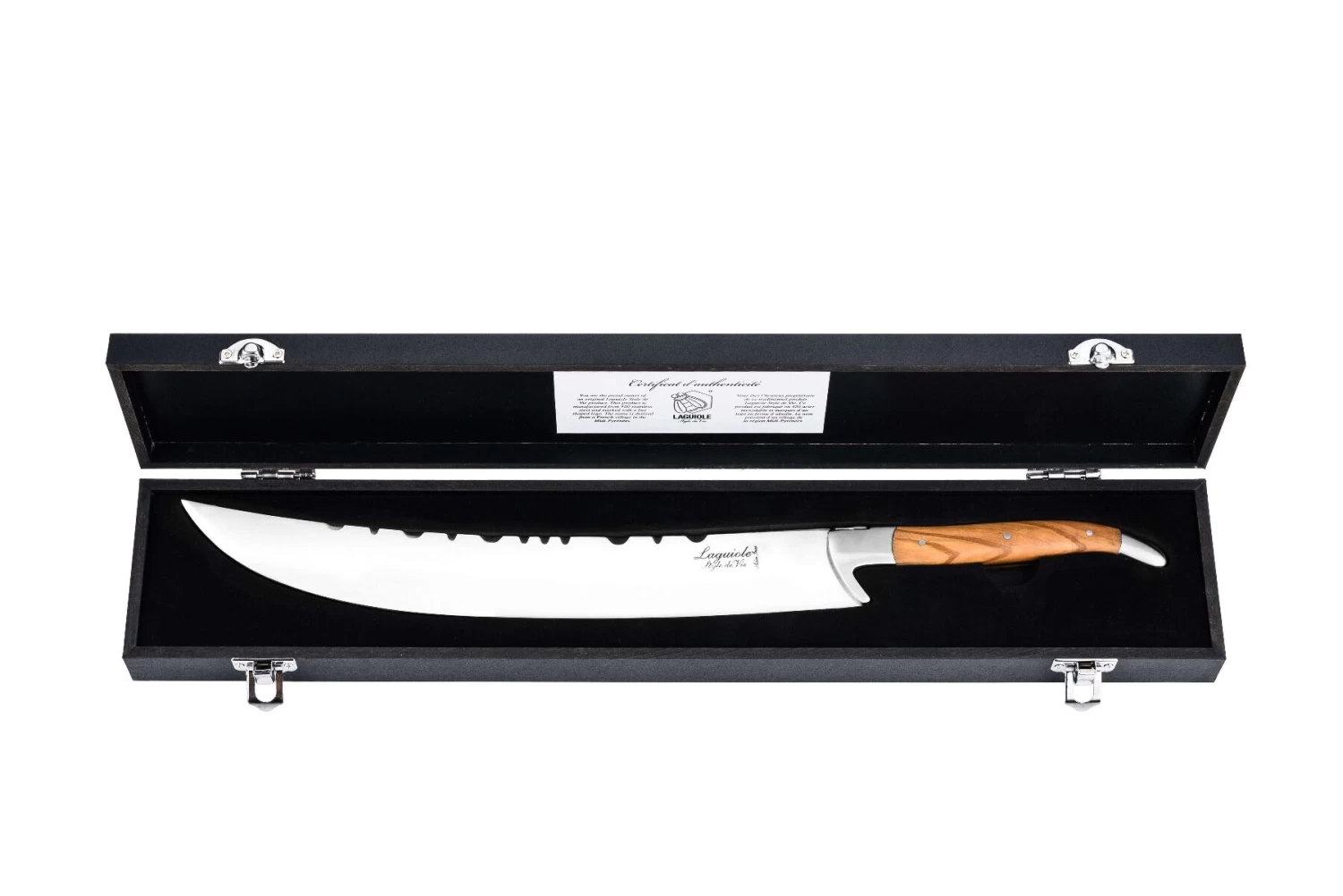 De Laguiole Style de Vie champagnesabel of sabreermes heeft een totale lengte van 41 cm. De sabel is vervaardigd uit gehard staal en is voorzien van een olijfhouten heft. Het sabreermes wordt geleverd in een luxe houten kistje. Gebruik voor het op luxe wijze sabreren van champagneflessen.