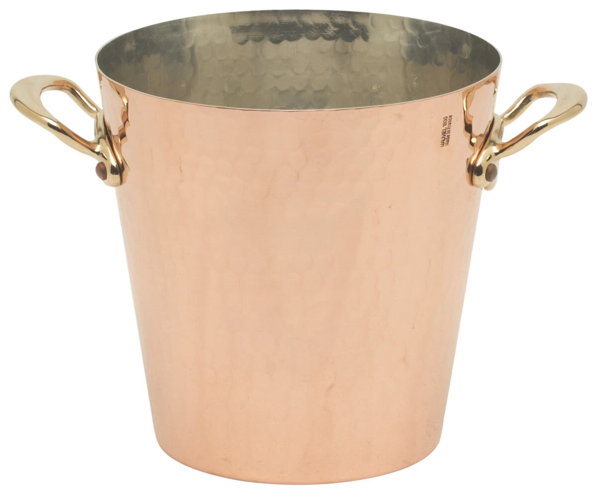 De Mauviel M’30 champagne-emmer heeft een conische vorm en een diameter van 20 cm. De van gehamerd koper gemaakte de emmer is voorzien van twee messing grepen. De binnenzijde van de emmer is vertind om het koper te beschermen tegen oxideren. Vul de emmer met ijs en water om een fles champagne te koelen.