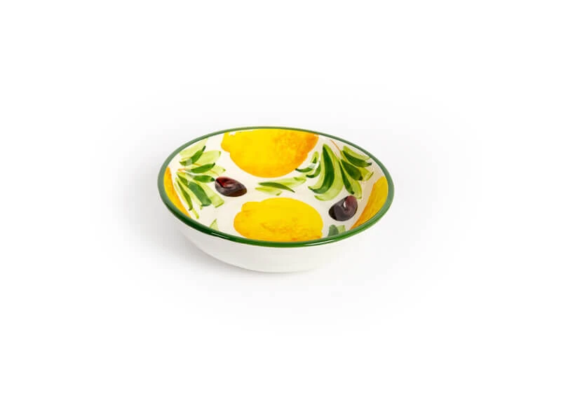 De ronde Oldenhof schaal is gemaakt van wit aardewerk en is gedecoreerd met citroenen en olijven. De diameter van de schaal is 16 cm en de hoogte is 4 cm. Het schaaltje is gemaakt om te gebruiken als fruit- of dessertschaaltje, maar ook voor het presenteren van hapjes.