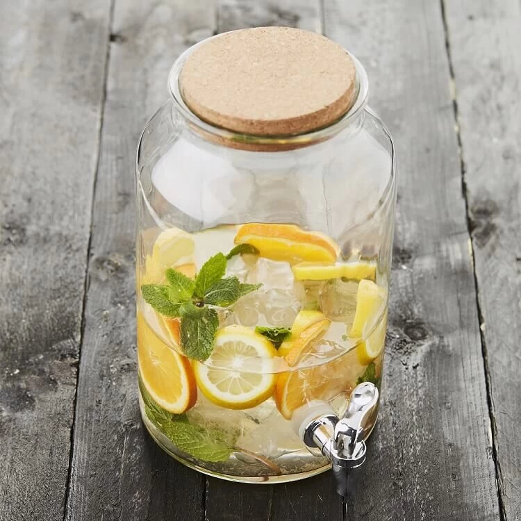 De Point-Virgule drankendispenser is vervaardigd uit transparant glas en is voorzien van een tap. Vul de dispenser met koude drank en houdt een glas onder de tap om deze te vullen met limonade.