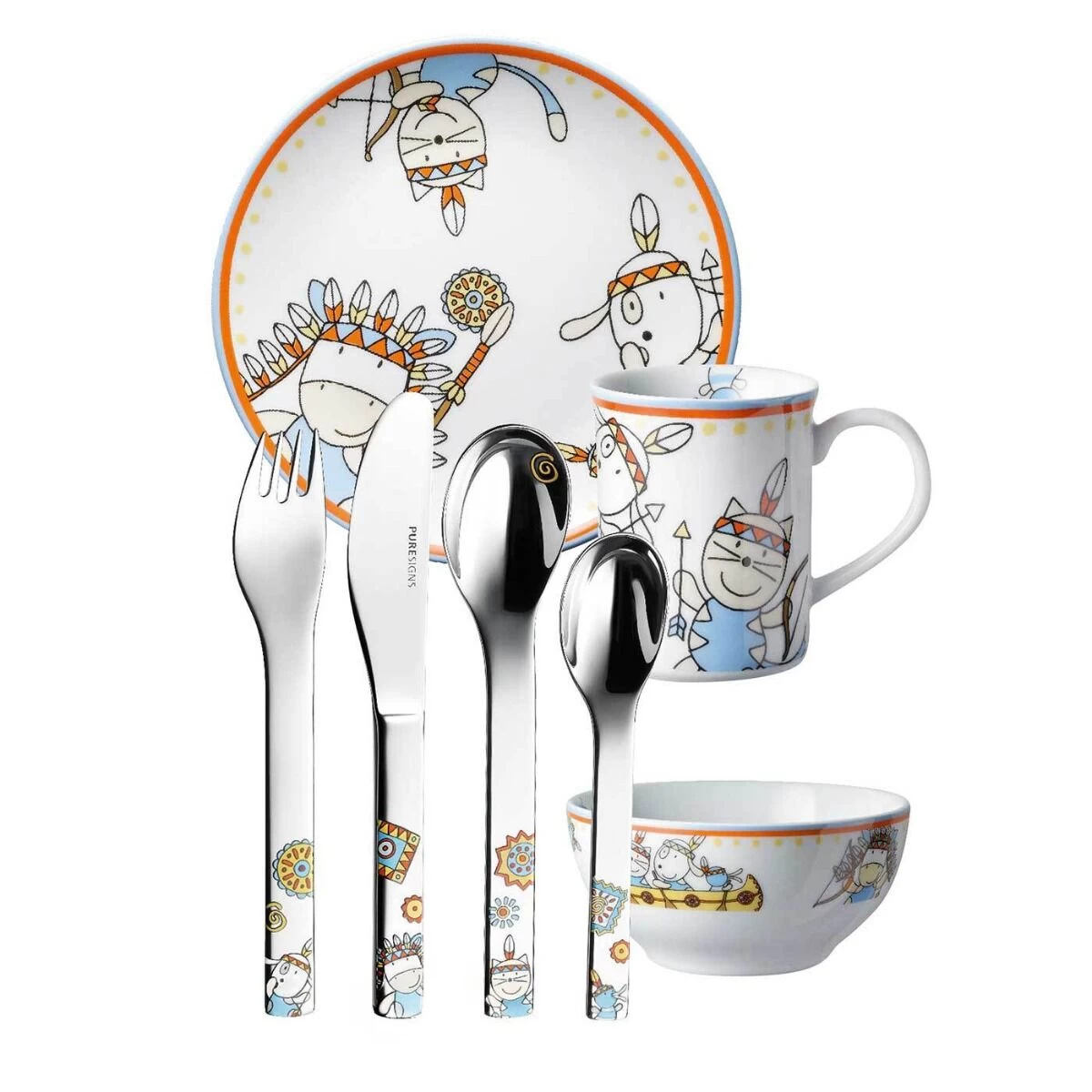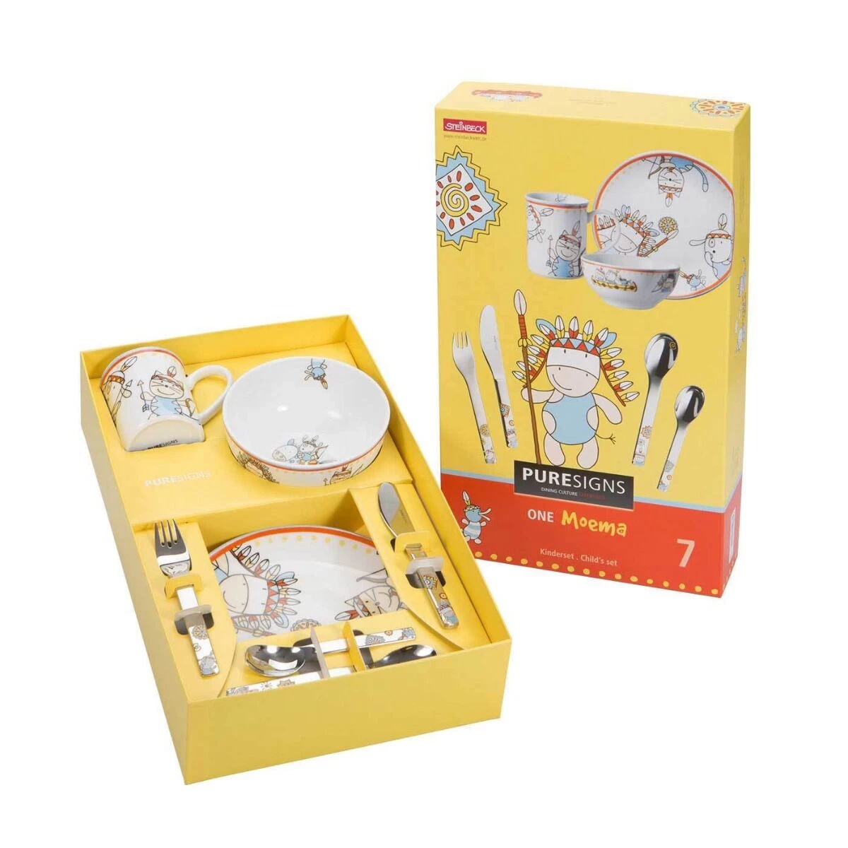 Het Puresigns Moema kinderserviesset 7-delig is vervaardigd uit glanzend roestvrij staal en porselein. Het bestek is speciaal gemaakt voor kleine kinderhandjes en is extra veilig afgerond.